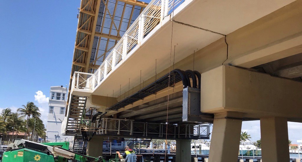 Project improvements include installing articulated concrete blocks (ACB) for erosion prevention within the navigable channel and the bridge foundation. The project also includes removing and replacing the existing bicycle plates and underwater cabling system.
